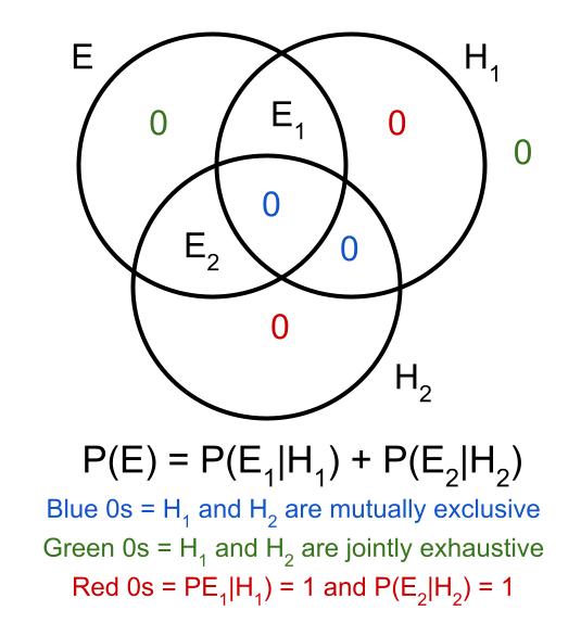 - This Venn Diagram shows that P(E) = P(H1) P(E|H1) + P(H2) P(E|H2), where H1 and H2 are mutually exclusive and jointly exhaustive: