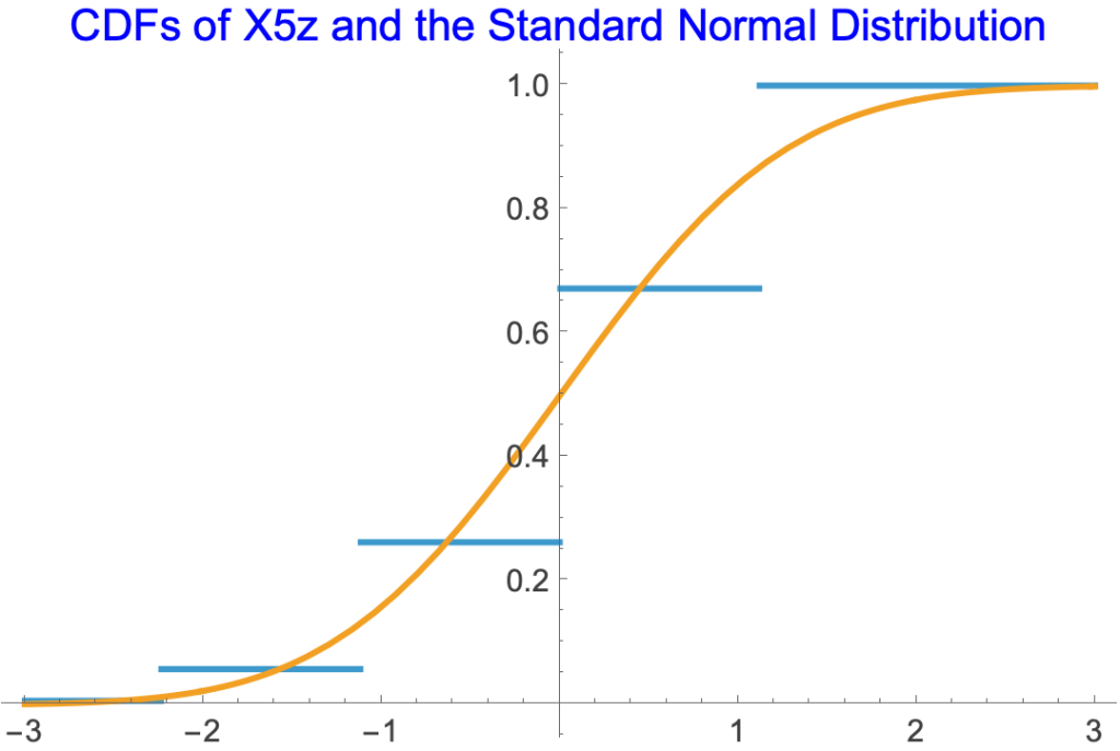 - X5z =TransformedDistribution[((u1+u2 + u3+u4 + u5)/5 – 0.8)/(0.4/√5),