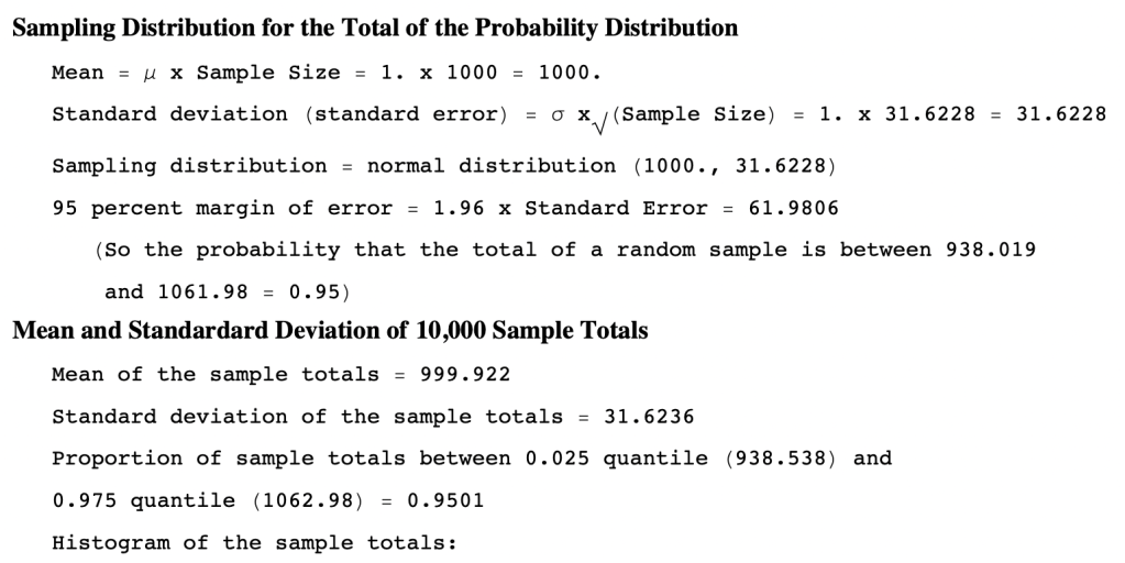 - Per the CLT, the probability distribution of the sum of 1,000 independent Xs is approximated by the normal probability distribution with mean = 1000μ and standard deviation = σ√1000.