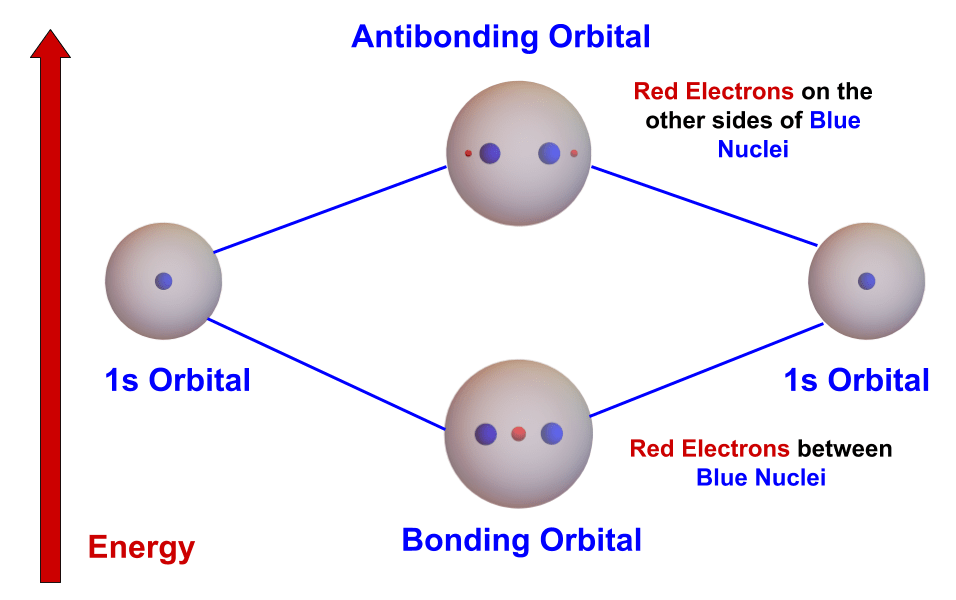 - First we build the molecular orbitals of the molecule from the 1s atomic orbitals. By adding the atomic orbitals we create the lower-energy, spherical bonding orbital. By subtracting the atomic orbitals we create the higher-energy, two-sphere antibonding orbital. We then put the nuclei next to each other in the two molecular orbitals.