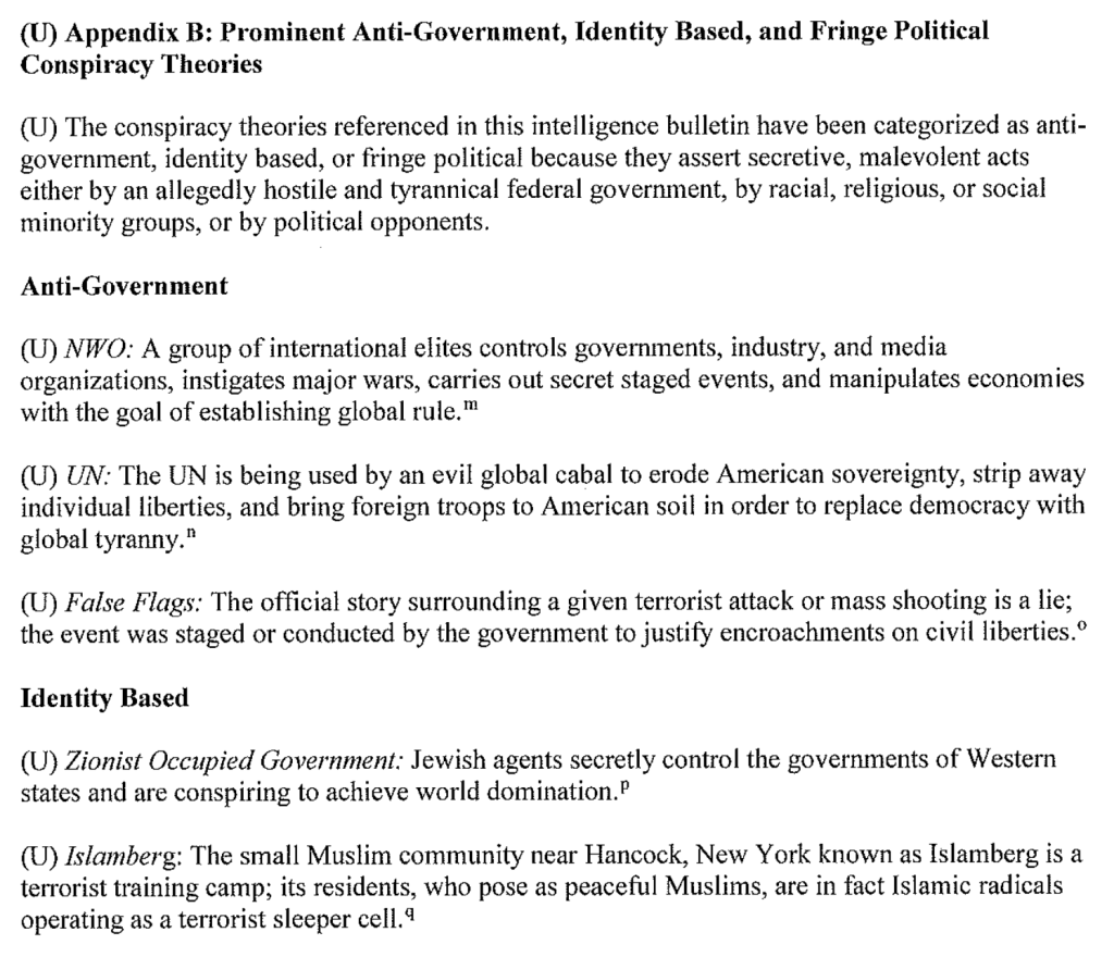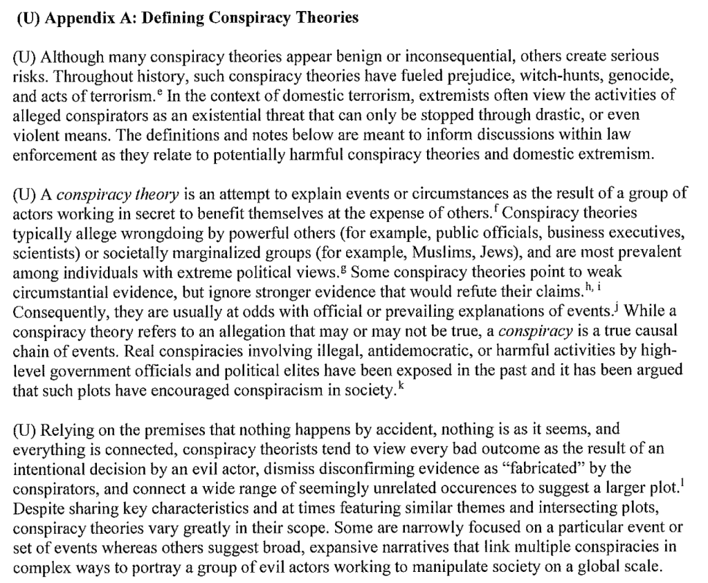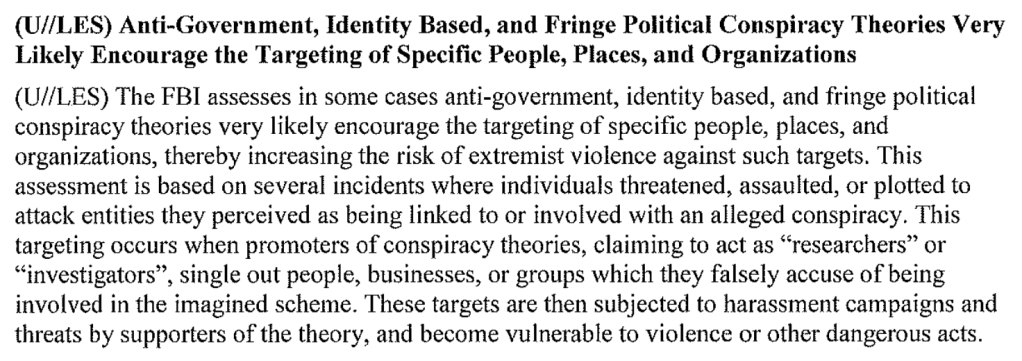 - The FBI assesses in some cases anti-government, identity based, and fringe political conspiracy theories very likely encourage the targeting of specific people, places, and organizations, thereby increasing the risk of extremist violence against such targets.