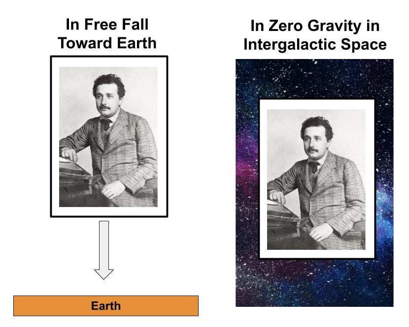 - “For an observer falling freely from the roof of a house there exists—at least in his immediate surroundings— no gravitational field. The observer therefore has the right to interpret his state as at rest.”