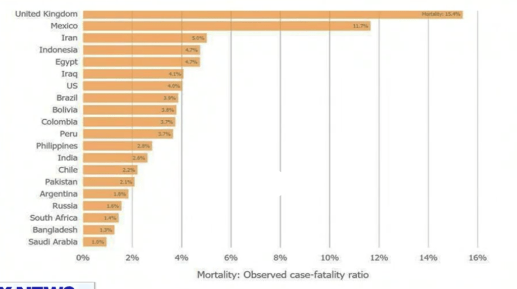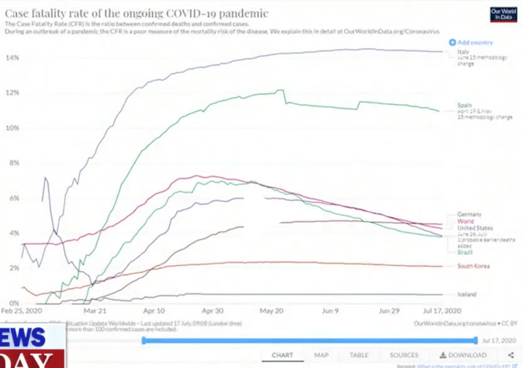 - WALLACE VOICE OVER: All right. It’s a little complicated. But bear with us. We went with numbers from Johns Hopkins University which charted the mortality rate for 20 countries hit by the virus. The US ranked 7th, better than the United Kingdom but worse than Brazil and Russia.