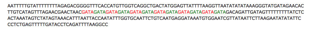 - For example, at position D7S280 on chromosome 7 the letters GATA are repeated 6 to 15 depending on the person. The DNA sequence of alternating red and green below has 12 repeats of GATA: