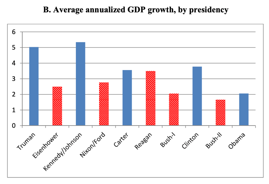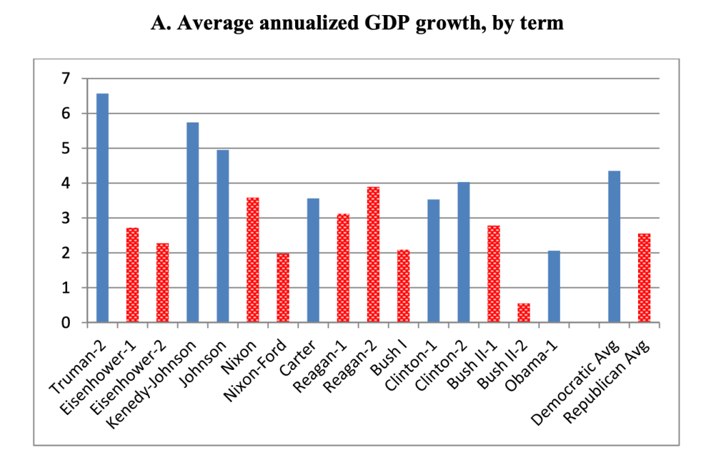 - Between 1947-2013 real GDP grew at an annualized rate of 3.33% Under Democratic presidents the growth was 4.33% versus 2.54% under Republican presidents.