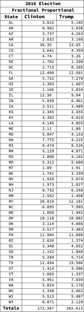 Result if a state’s electoral votes are awarded to candidates, as decimal fractions, in proportion to their popular vote in the state: