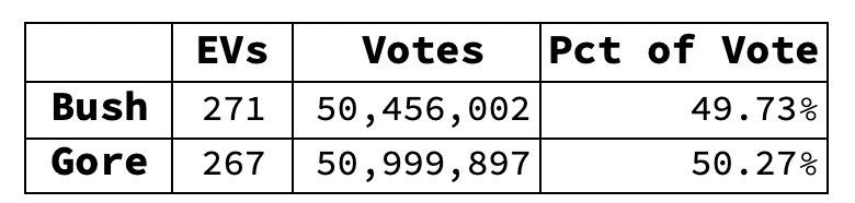 - Under the Fractional Proportional system, the 2000 presidential election (in which Gore received more votes but lost the election), Bush still would have beaten Gore, this time 269.232 electoral votes to 268.768.