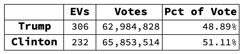 (Percent of Vote is the percent of the two-party vote. Electoral votes ignore faithless electors.)