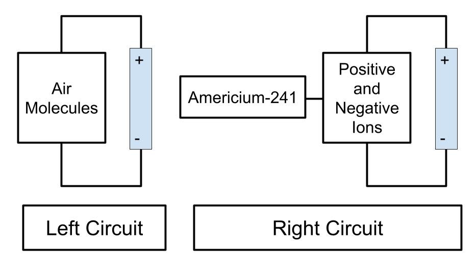 - The Chamber of the Right Circuit consists of positive and negative ions, thanks to the attached supply of the radioactive element Americium-241.