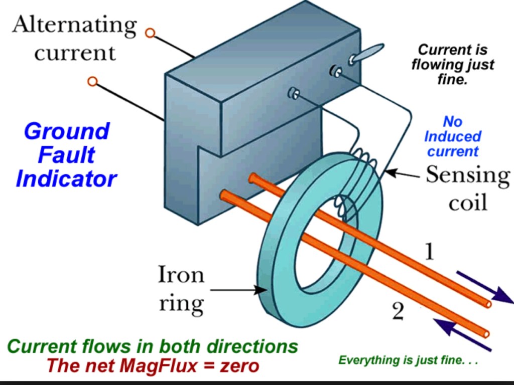 If the current in one wire becomes greater than the other, a magnetic field is produced in the Iron Ring by Ampere’s Law. The increasing magnetic field through the Sensing Coil induces a current (by Faraday’s Law) that breaks the circuit.