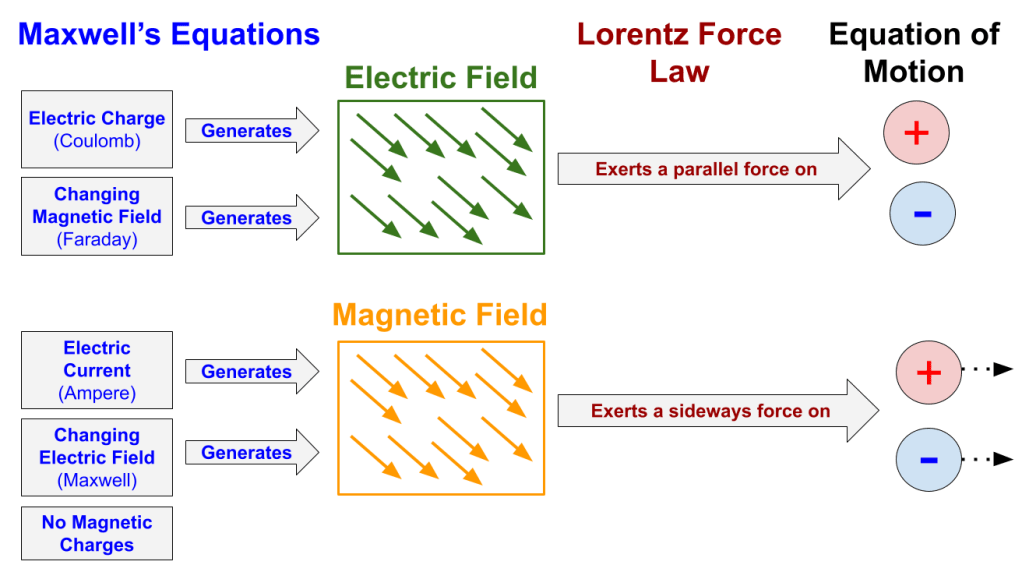 - Maxwell’s Equations describe how electric and magnetic fields are generated.