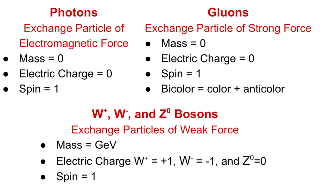 - Particles with half-integer spin interact by exchanging W+, W–, and Z0 Bosons