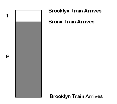 - Since Ernie arrives at the station at random times, the Bronx train arrives first 1/10 of the time and the Brooklyn train 9 times of 10.