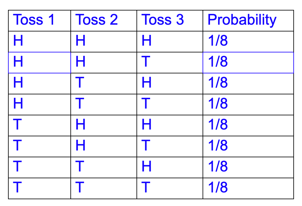 - P(H1 & H2 & H3) = P(H1) x P(H2) x P(H3) = ½ x ½ x ½ = ⅛