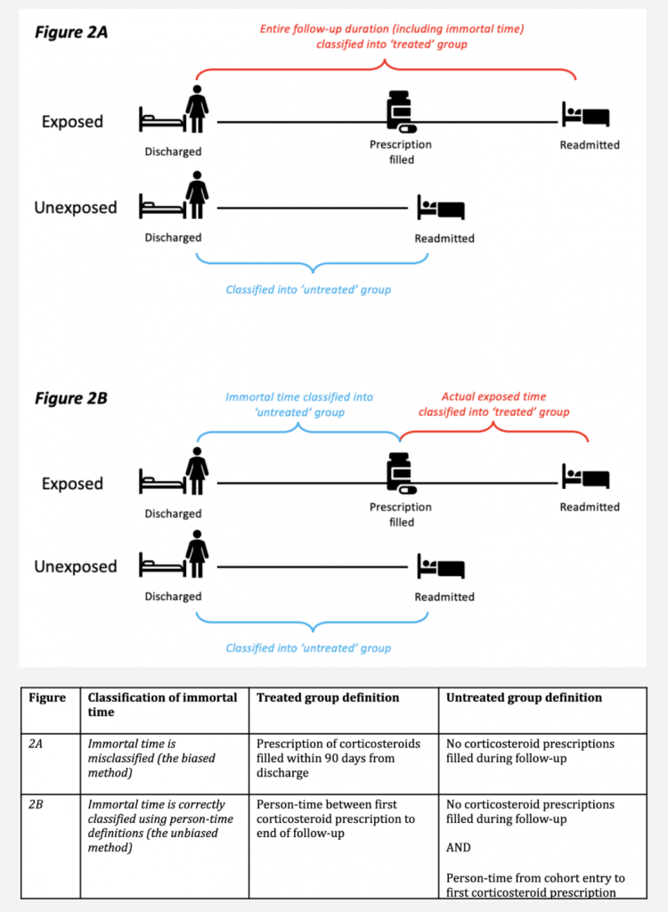 - To highlight one example, several observational studies reported that inhaled corticosteroids could effectively prevent readmission and mortality in patients previously hospitalized with COPD. In the original studies, immortal time bias was introduced because participants entered the cohort on the day they were discharged and were then assigned to the treated group if they filled a prescription for a corticosteroid within the first 90 days from discharge. By design, participants allocated to the treated group could not have died or been readmitted between the time of entering the cohort and the time of filling their first prescription. In effect, they contributed ‘immortal time’ to the treated group. The original studies misclassified this immortal person-time to the treated group (rather than the untreated group) and immortal time bias was induced (see Figure 2)