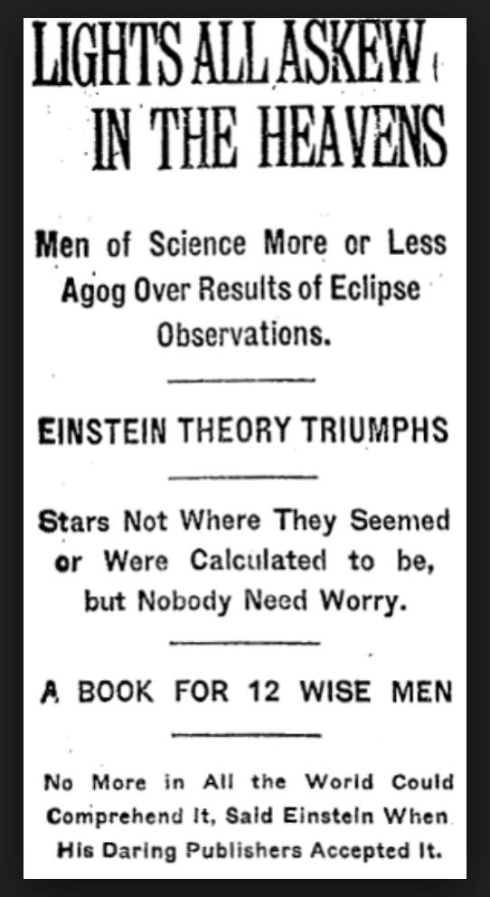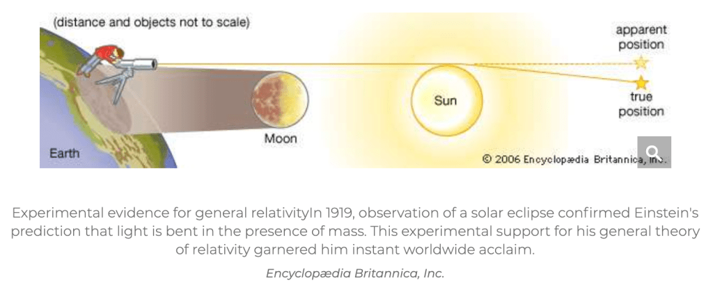 - In 1919 English astronomer Sir Arthur Eddington verified this prediction by observing a star behind the Sun during a total eclipse. Light from the star was deflected 1.75 seconds of arc, as predicted by General Relativity.