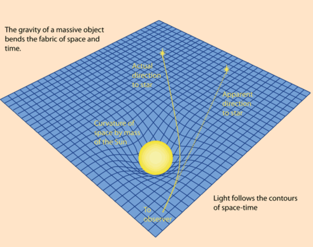 - General Relativity predicts that massive bodies like the Sun make nearby spacetime so curved that light rays passing by are deflected.