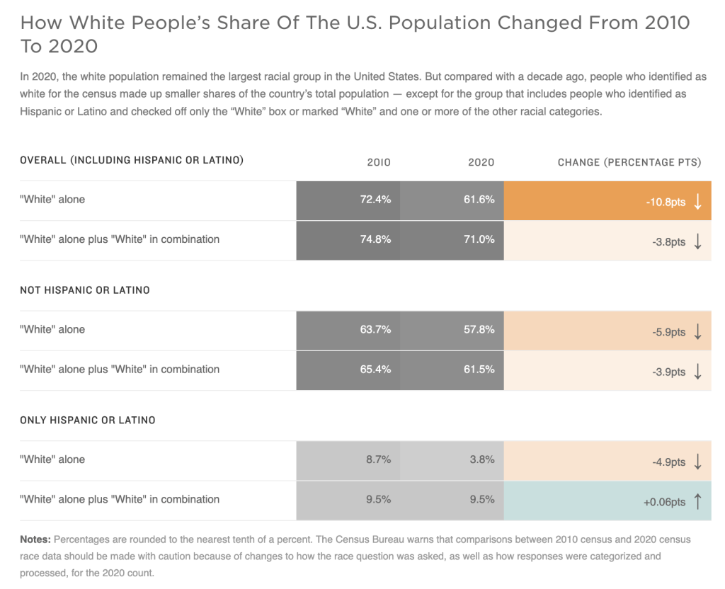 - There could be “unexpected differences,” the bureau has said, that may not necessarily be just the result of demographic shifts. Some of the bureau’s changes for the 2020 census may have increased the number of people recorded as identifying with the “White” category and at least one of the other racial categories. Last year’s census, like the 2010 count, may have also overcounted the “non-Hispanic white alone” population.