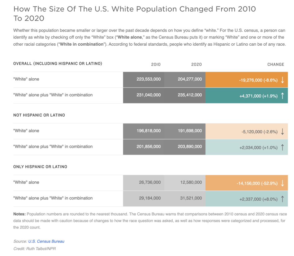 - Some recent analysis of the new census data, however, has homed in on a more narrowly defined group with falling numbers — people who only marked the “White” box for the race question and did not identify as Hispanic or Latino (which is not a racial category according to federal standards).