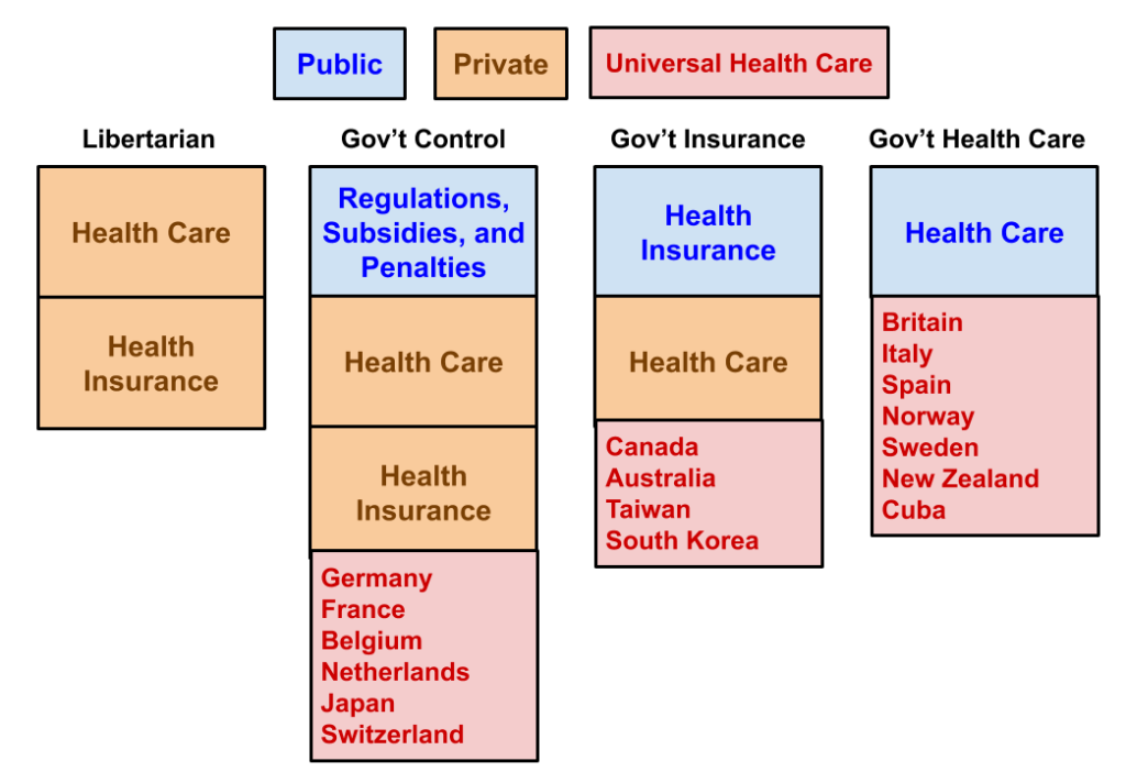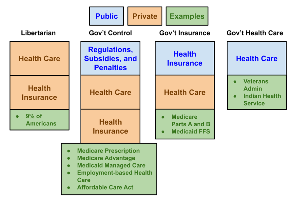 - The government provides health care: doctors, nurses, technicians, hospitals, clinics, labs.