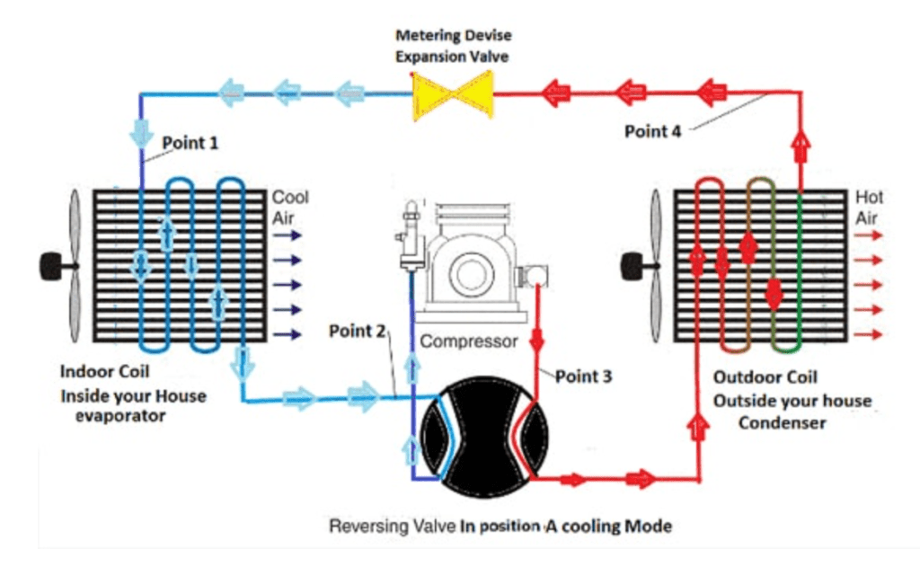 - Point 1: Very cold liquid refrigerant enters the outside coil