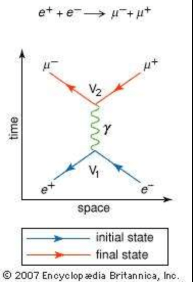 - Positron e+ and electron e‒ approach each other on the horizontal axis, collide, and are annihilated, releasing the photon 𝛾, which splits into a muon (𝜇‒) and an antimuon (𝜇+)