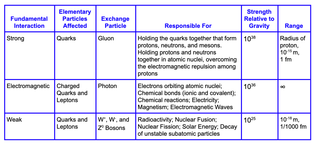 - Its exchange particles are the W+, W–, and Z0 Bosons