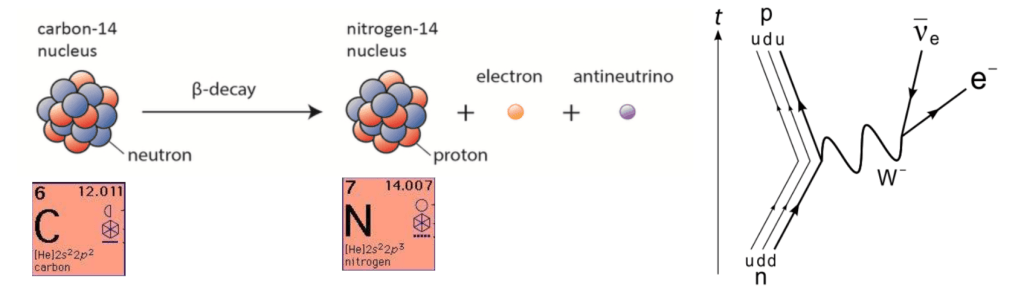 - This happens when a neutron in the carbon-14 nucleus decays into a proton, through Electron Emission Beta Decay. In this process, a down quark (d) changes flavor into an up quark (u), emitting an electron (e–) and an antineutrino (𝜈e).