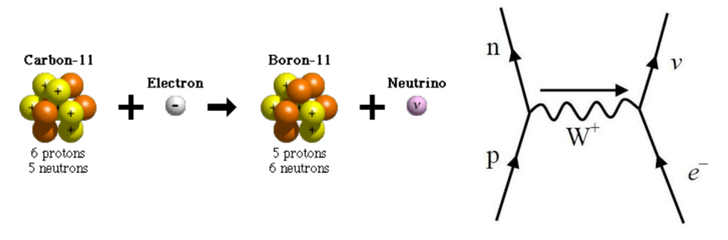 In Electron Capture Beta Decay an orbital electron in an atom’s inner shell is captured by the nucleus where it combines with a proton, which decays into a neutron and emits a neutrino. The atom is therefore lowered by one atomic number, e.g. from Carbon with 6 protons to Boron with 5