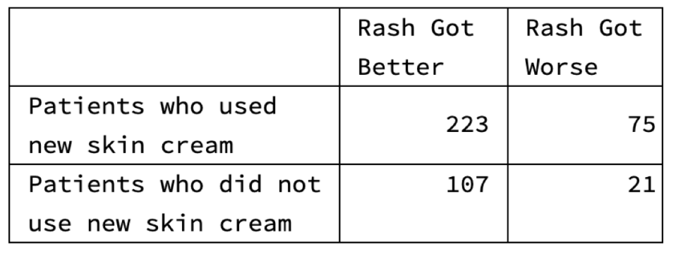 - The rational answer was that the results supported the conclusion that the skin cream was likely to make the rash worse because the rash got worse for 25 percent of those using the skin cream, compared to 16 percent of those not using the skin cream.