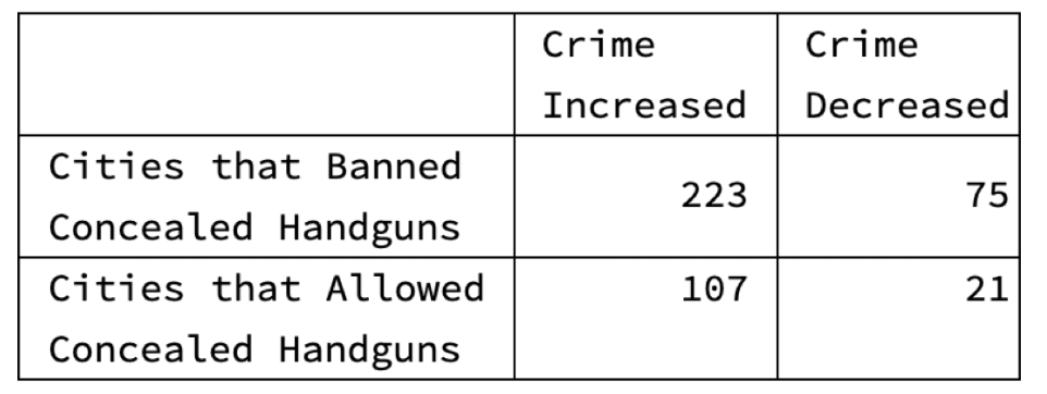- A. Cities that enacted a ban on carrying concealed handguns were more likely to have a decrease in crime than cities without bans.