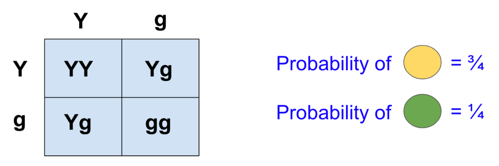 If each parent plant has Yg-Merkmale, Mendel’s postulates predict that the probability a child plant has yellow peas is ¾.