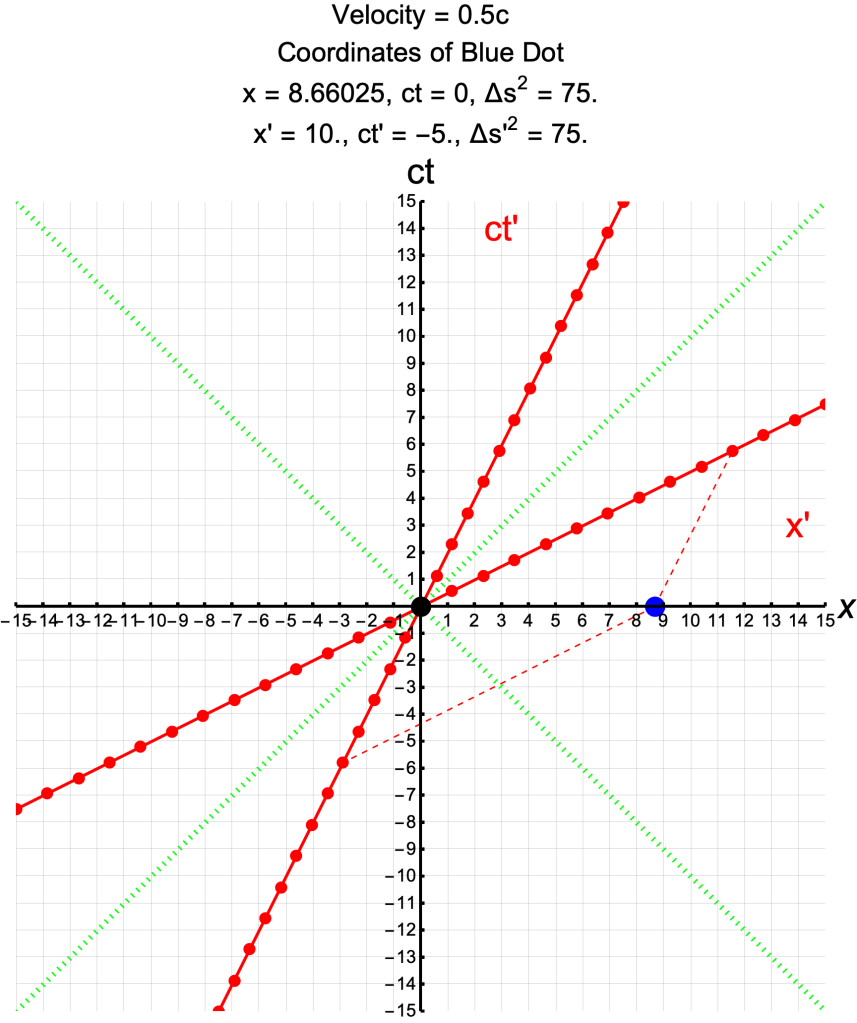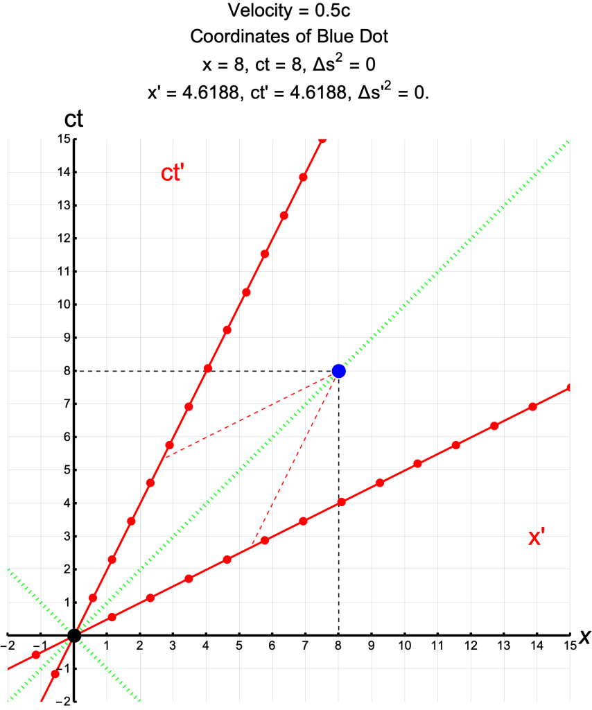 - The coordinates, ct and x, for every point on the blue lines, satisfy the equation