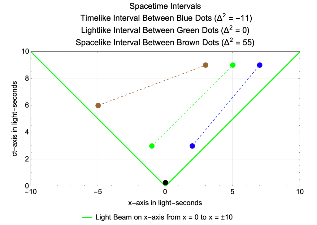 - The spacetime interval between the brown events is spacelike.