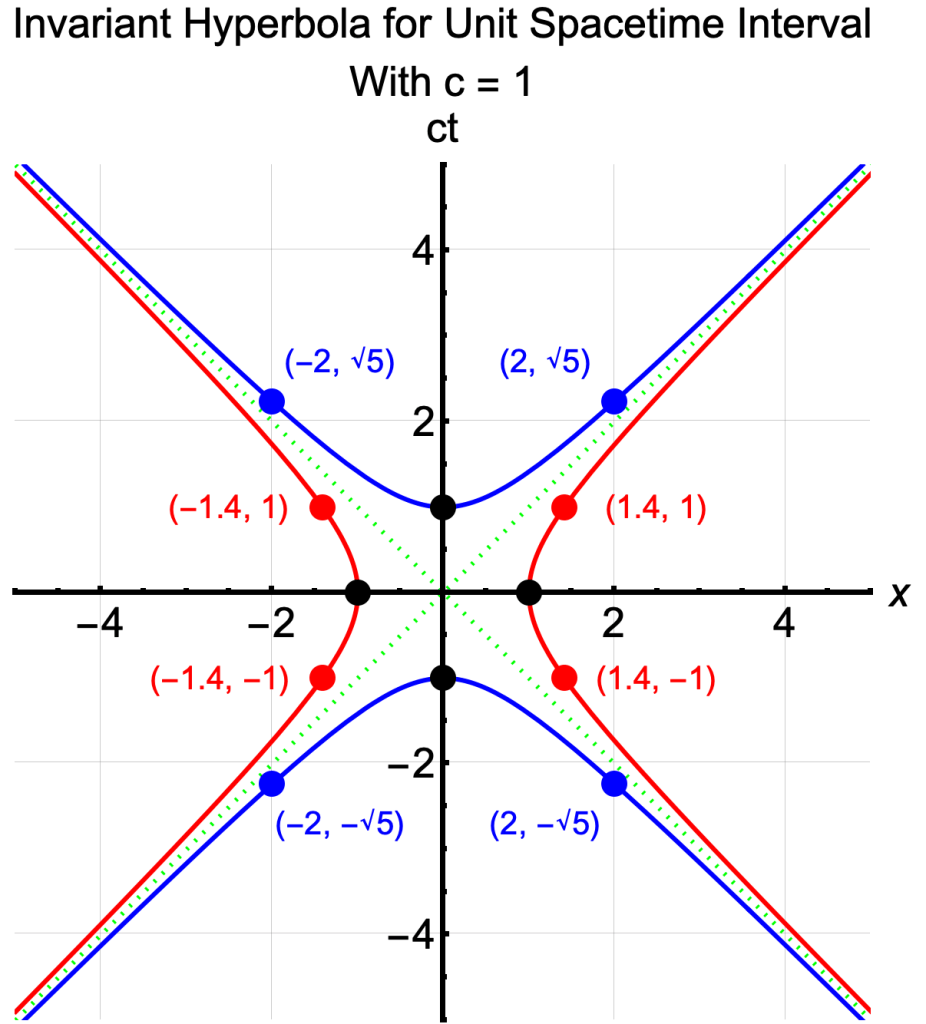 - The formulas for the spacetime intervals of -1 and +1 are equations of hyperbolas:
