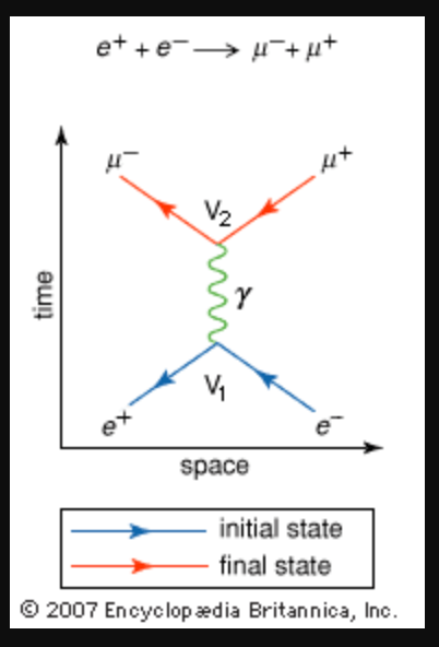 - In the Feynman Diagram at right an electron (e–) and its antiparticle, the positron (e+), annihilate each other when they collide at V1, creating a gamma ray photon γ, which at V2 becomes a muon (𝜇–) and an antimuon (𝜇+). Energy is conserved throughout the process: