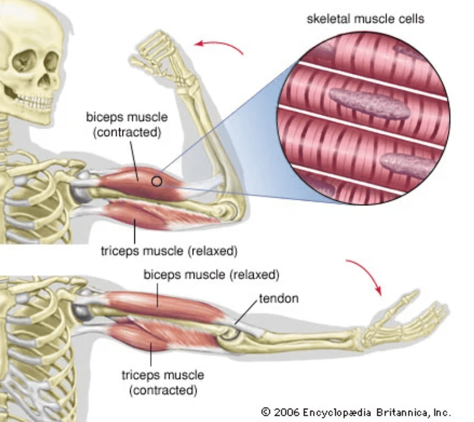 You bend your arm at the elbow by making your biceps muscle contract. And you straighten your arm by making your triceps muscle contract.