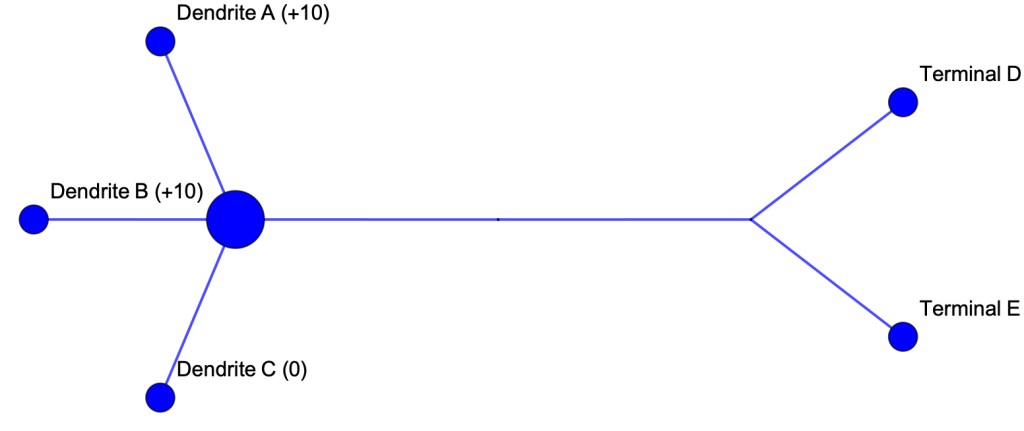 - Presynaptic neurons synapsing on Dendrites A, B, and C fire simultaneously, causing the neuron’s potential to increase to -65 mV.