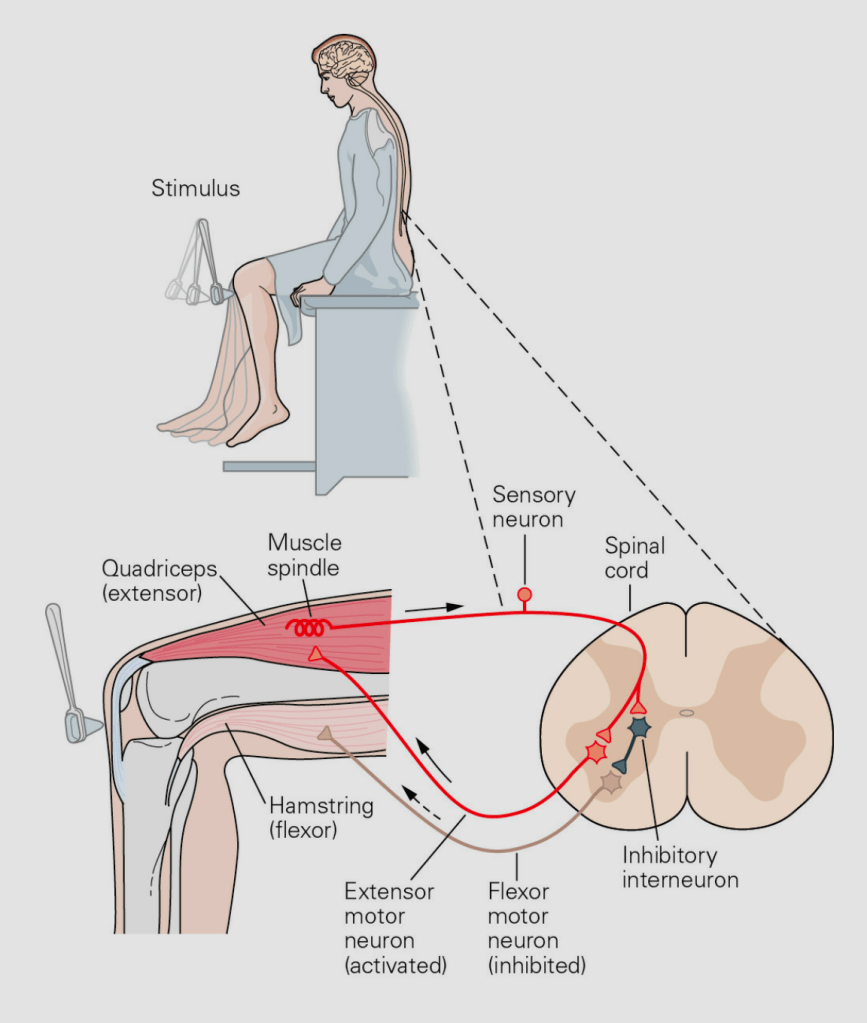 - The action potentials of the sensory neurons also make the short interneurons fire, which releases an inhibitory neurotransmitter to the motor neurons to the hamstring, preventing the hamstring from contracting, thus preventing the knee from bending.
