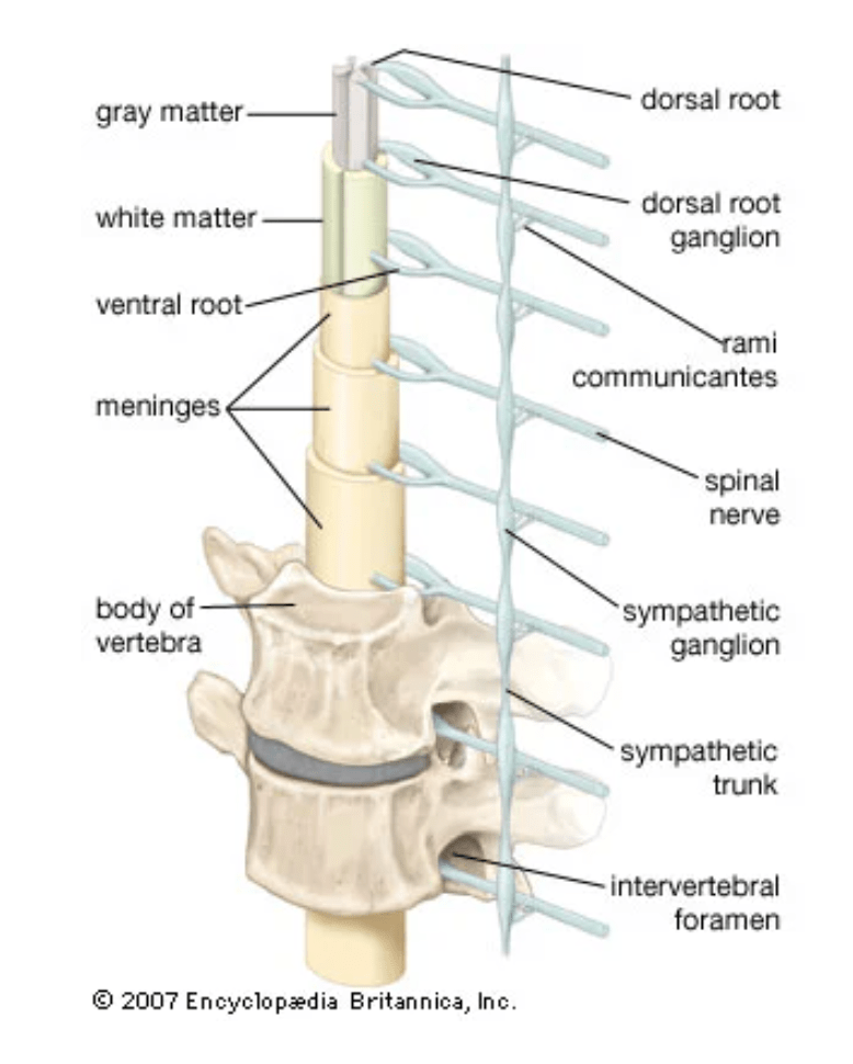 - the peripheral nervous system, consisting of nerves (i.e. enclosed bundles of neurons) running from the spinal cord to regions in the body