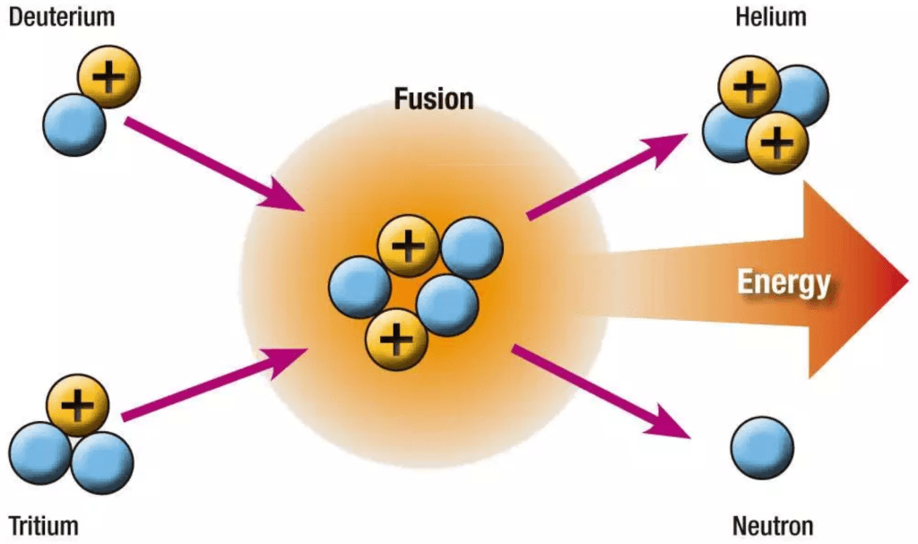 - (1 Hydrogen-2 + 1 Hydrogen-3) → (1 Helium-4 + 1 neutron)