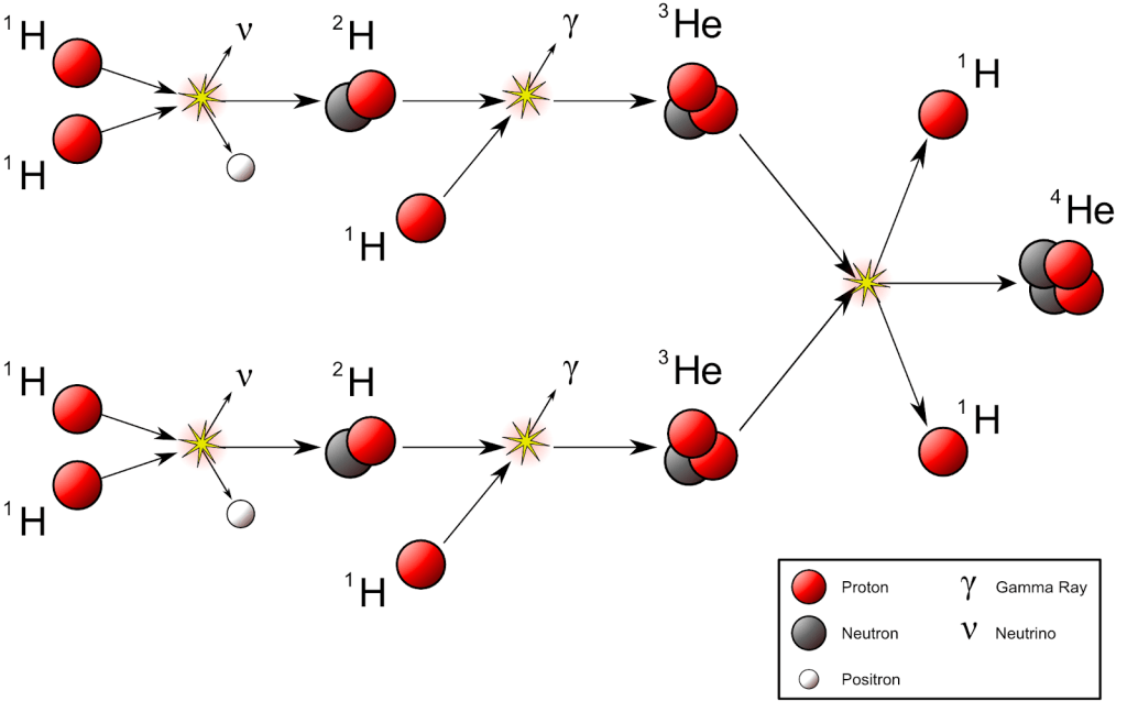 - (6 Hydrogen-1) → (1 Helium-4 + 2 Hydrogen-1)