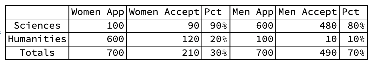 - Suppose 700 men and 700 women apply to graduate school. 210 women are accepted vs 490 men. That’s 30% vs 70%.