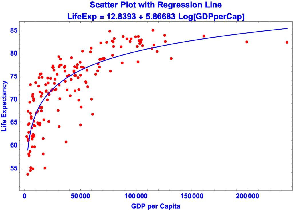 - Regression Equation; y = 12.8393 + 5.86683 Log[$]