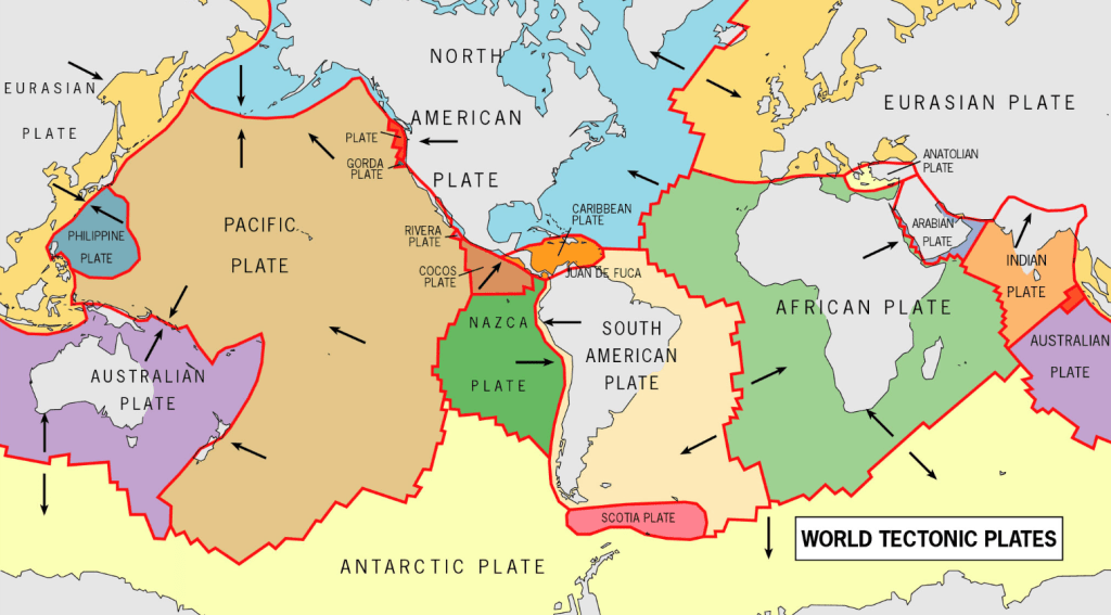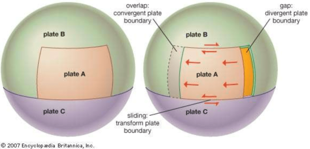 A mosaic of rigid geologic plates covers the Earth’s surface, forming the Lithosphere.