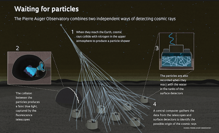 The fields are observed as particles, leaving tracks and traces in particle accelerators and cosmic ray detectors.