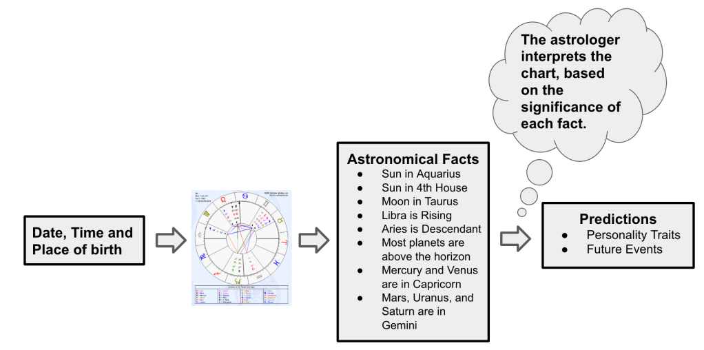 - Astrologers were given the date, time and place of a subject’s birth, which they used to construct a natal chart and describe the subject’s personality traits. The subject was given that interpretation plus natal chart interpretations of two other, randomly-selected subjects in the test The subject had to determine which of the three natal chart interpretations was his.