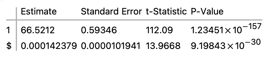 - Regression Equation: y = 66.5212 + 0.000142379 x