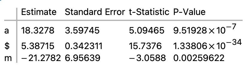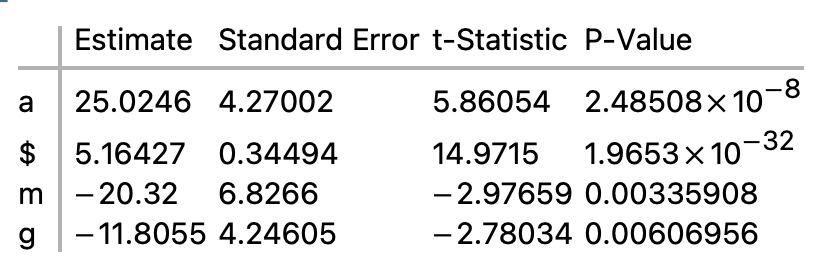 - Regression Equation; y = 73.3606 – 12.435 g – 38.764 m + 0.00011775 $