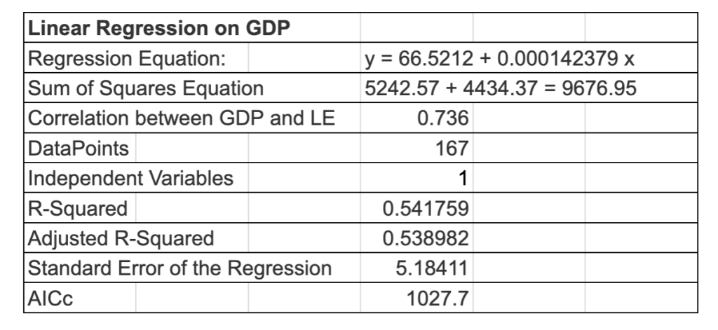 - R-Squared is 0.541759, meaning that the regression captures about 54% of the life expectancy scatter. That’s fine, but not great.
